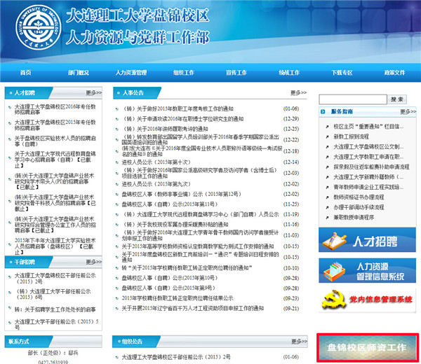 2、点击首页右下角标志:盘锦校区师资工作(上如图红框标注部分)